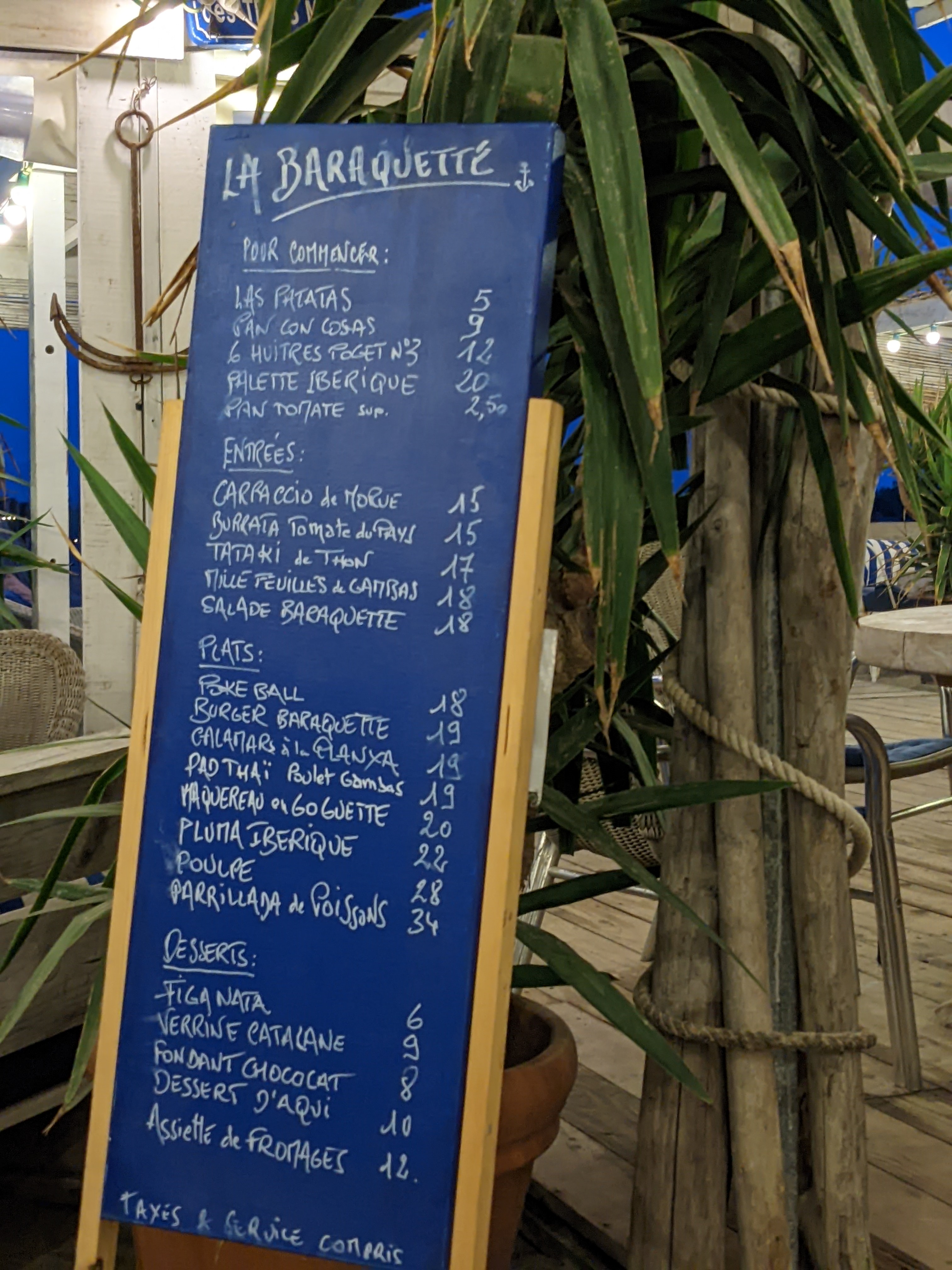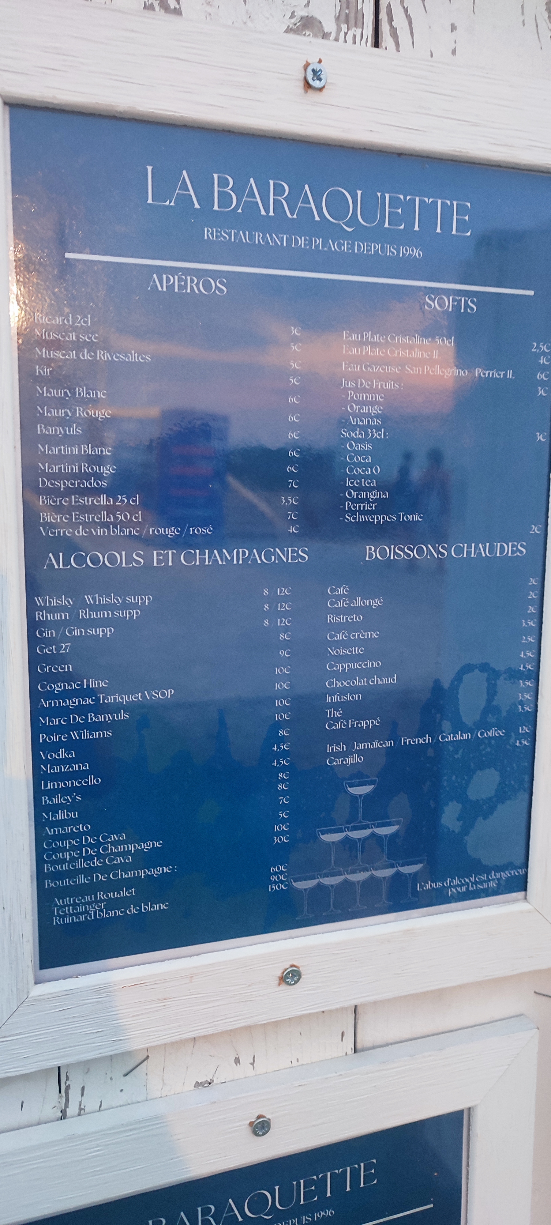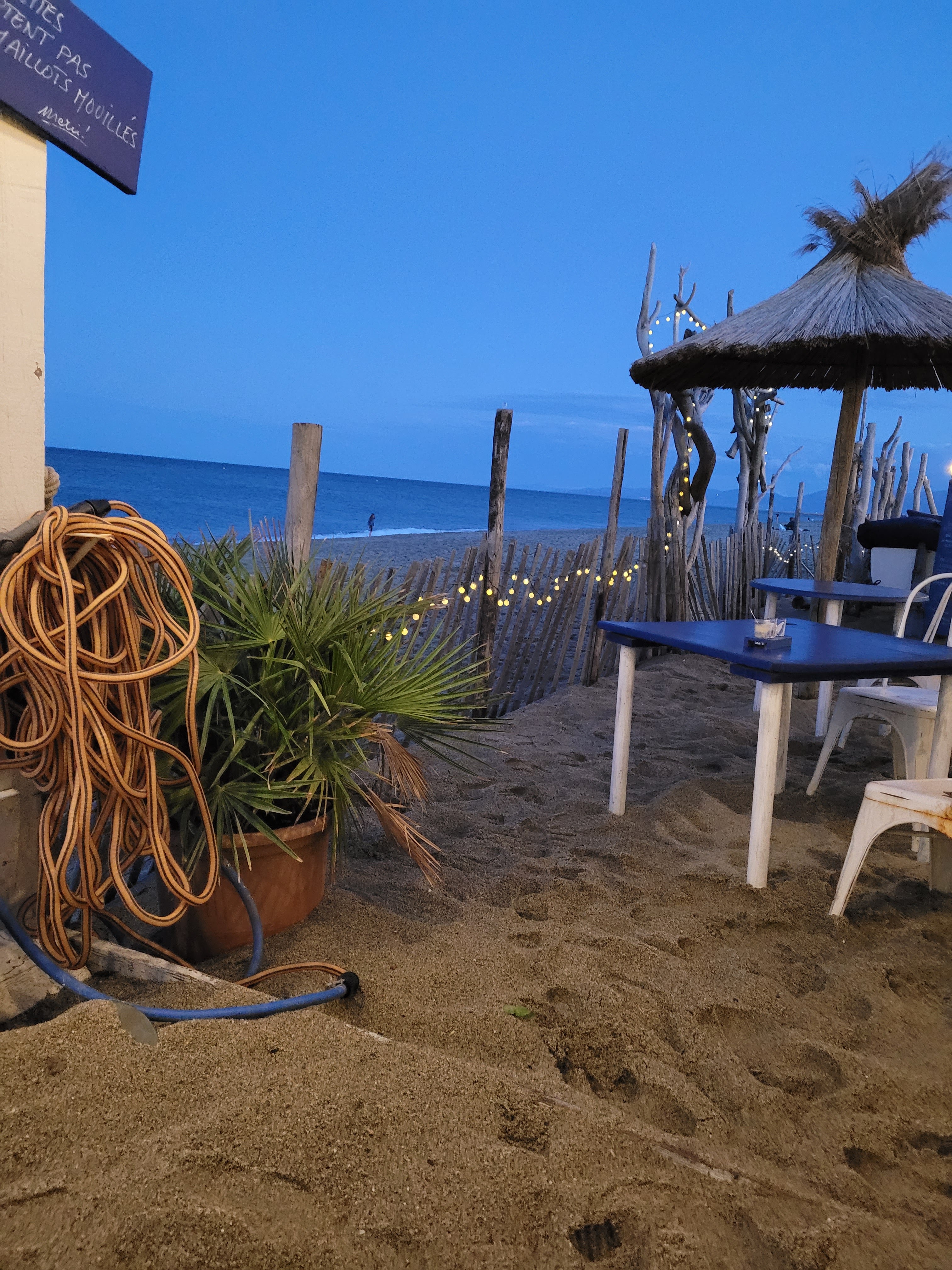 Nous avons reservé une table pour 7 personnes ( 7 adultes) pour 20h15 pour dîner. Nous avons été installés sur une table et des canapés complètement enfoncés dans le sable et en pente. Une fois assis nos genoux se retrouvaient au dessus du plateau de la table, position très peu agréable. Bon admettons il s'agit d'un club de plage. On nous informe que le four est en panne et que les os à moelle ne seront pas de ce fait disponibles, chose qui peut arriver. De plus, on nous avise que les plats à base de poulpe et de thon ne sont pas disponibles. Il n'y en a plus en stock. Situation quelque peu étonnante, quand on tient un restaurant, qu'on a des réservations de ne pas savoir gérer ses stocks. Surtout que des clients arrivaient après nous, j'espère pour eux que les stocks restants étaient suffisants. Arrive la commande des apéritifs, la serveuse n'est pas en capacité de nous fournir le nom des whiskys superieurs qui sont proposés, pourtant il n'y en a que 3 dont le seul qu'elle se souvient est le Jack Daniel's. Pas très pro. Une fois la commande de l'apéritif passée, nous sommes servis et commençons à déguster nos boissons. Si vous cherchez de bon cocktail, frais et bien servis passez votre chemin. Nous cherchons encore le goût du gin fizz, la fraîcheur de la bière. Aucun petit plat d'olives, ou gâteau apéro chose que les restaurateurs offrent régulièrement, cela ne fait peut-être pas partie de la politique de cette maison, passons c'est un choix. Étant déjà venu dans cette établissement en début d'été, nous avons pris des plats que nous connaissions. Linguines aux palourdes, steak tartare, patatas bravas, effiloché etc... En 4 semaines les portions ont bien diminué, on voit que la saison a commencé et les touristes sont arrivés. Les pates servies avec les palourdes sont dignes d'une cantine scolaire, les palourdes fades sans aucune sauce, le steak tartare au couteau a dû lui aussi être coupé au couteau de cantine ainsi que la tonne d'oignon qu'il renfermait, là egalement la sauce était bien cachée. D'ailleurs nous en avons demandé en supplément nous l'attendons encore, le chemin doit être long pour aller en cuisine. Pour les autres plats, tous fades sans saveur, aucune présentation. Le pain devait dater du début de saison..... Voilà pour notre retour d'expérience, dommage un restaurant qui était correct il y a quelques temps, celui-ci est devenu un concurrent sérieux pour McDo. Donc si vous souhaitez manger en bord de plage à torreilles vous saurez quel restaurant éviter. D'autres sont de qualité il suffit de se mettre face à la mer et de faire quelques centaines de mètres sur la droite.