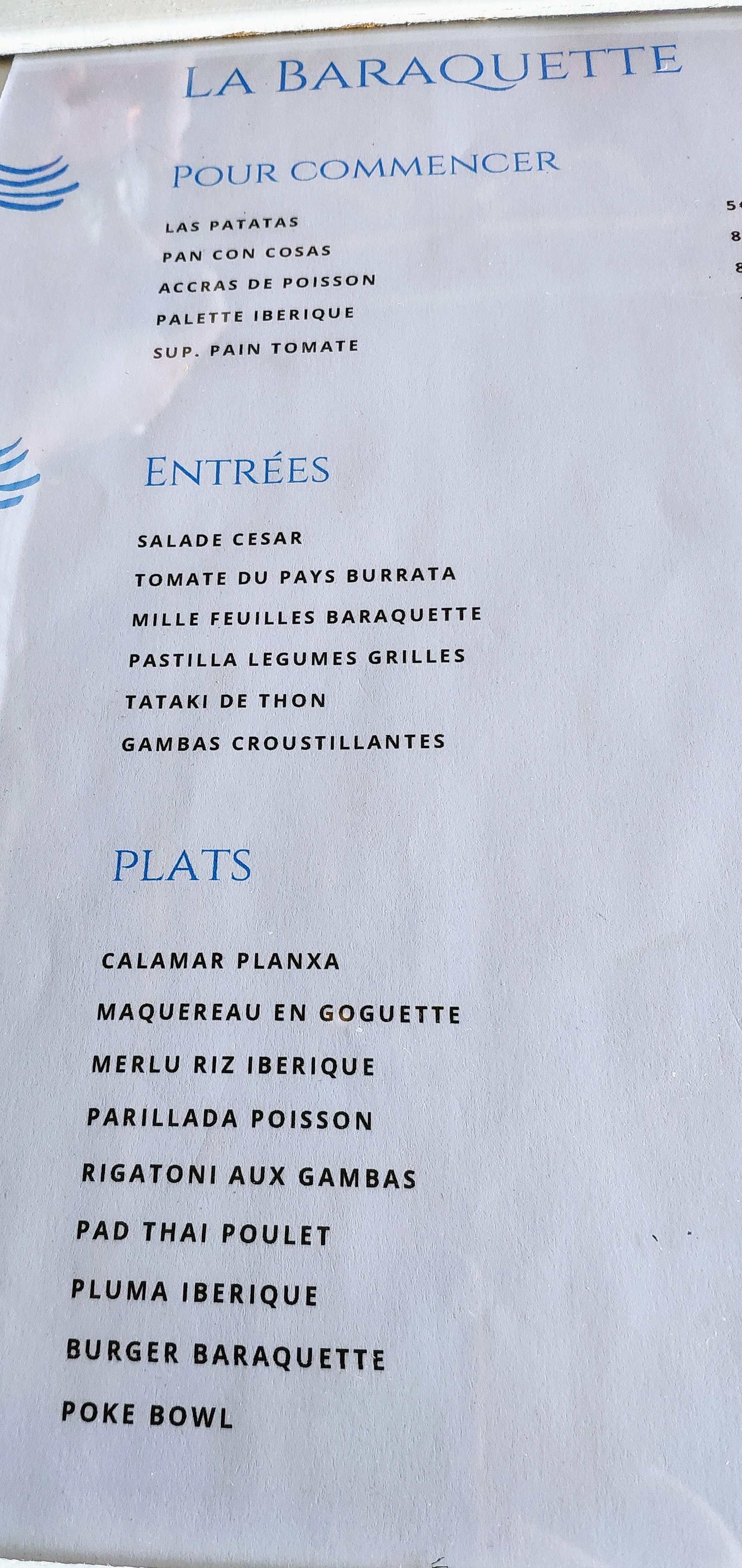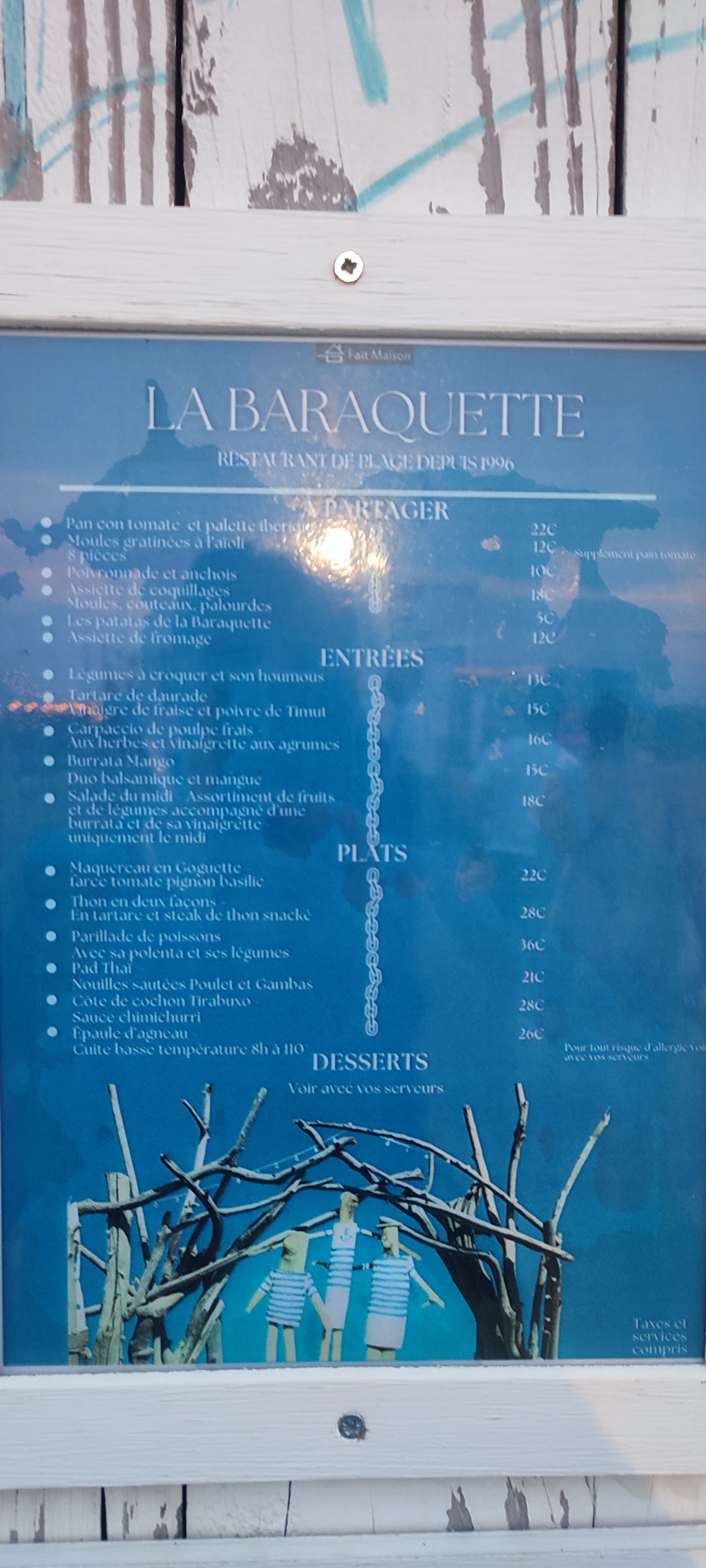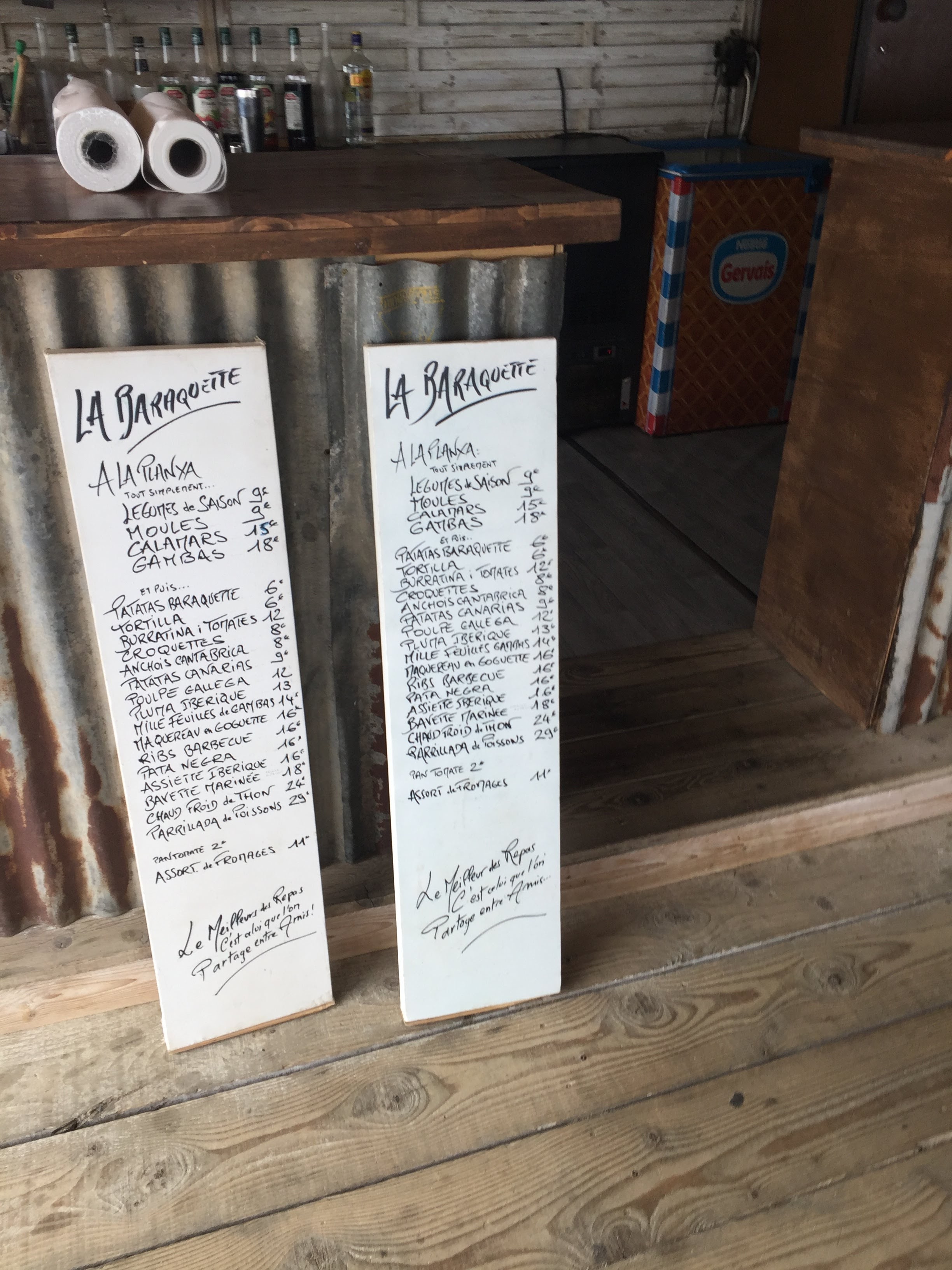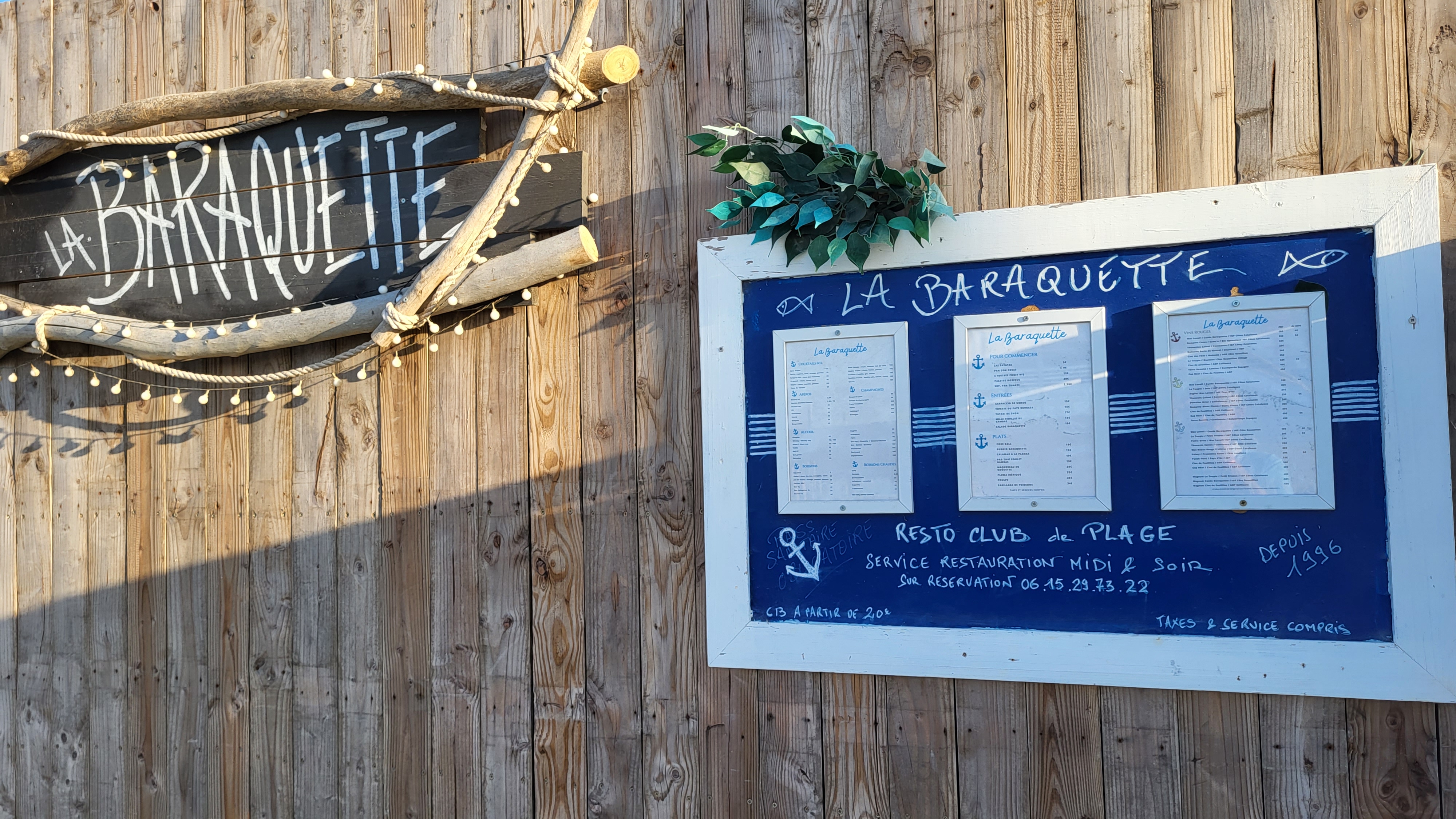 Nous sommes venus boire un verre. Évidemment, l’endroit est super, les pieds dans le sable. Hélas la patronne gâche tout dès les premières secondes : « vous pouvez boire un verre mais pas trop longtemps car nous dressons les tables dans 45 mn »... puis 2 mn après lorsqu’elle amène les verres je demande gentiment si elle peut mettre un coup d’éponge sur la table, qui n’est pas propre. Réponse : « vous auriez dû vous mettre sur une table propre »... pas de chance, celle d’à côté est dans le même état. Je lui fait remarquer que je demandais juste un coup d’éponge et que je ne lui faisais aucun reproche... Réponse : « heureusement ! » Bref, ça fait beaucoup en 5mn. Ici, visiblement le client doit filer droit et est peu respecté. Je comprends mieux pourquoi en ce magnifique samedi de début septembre la terrasse est aux 3/4 vide... Les clients vont là où on les respecte, c’est aussi simple que ça. Adieu la baraquette, c’est la dernière fois que vous me voyez.