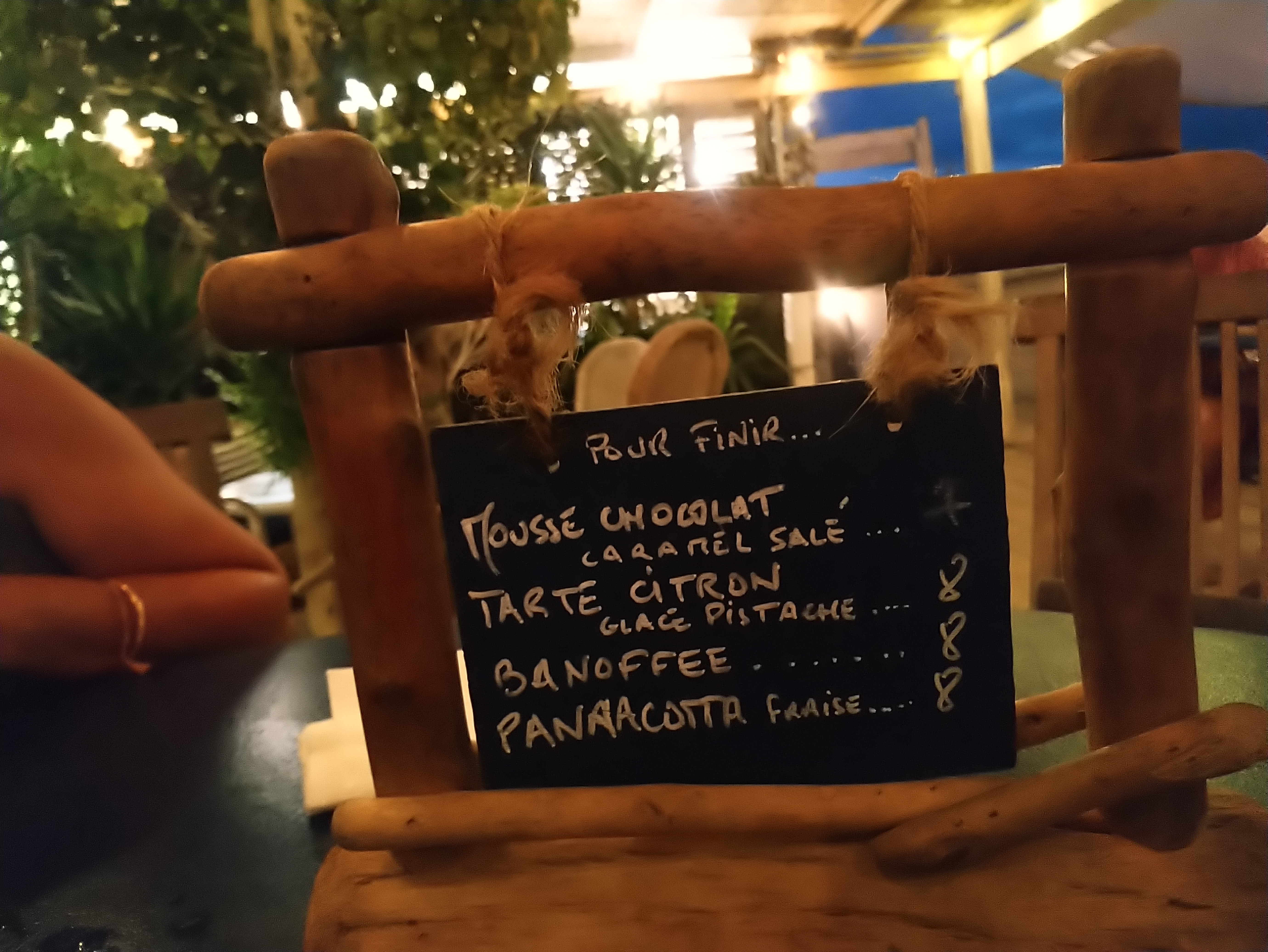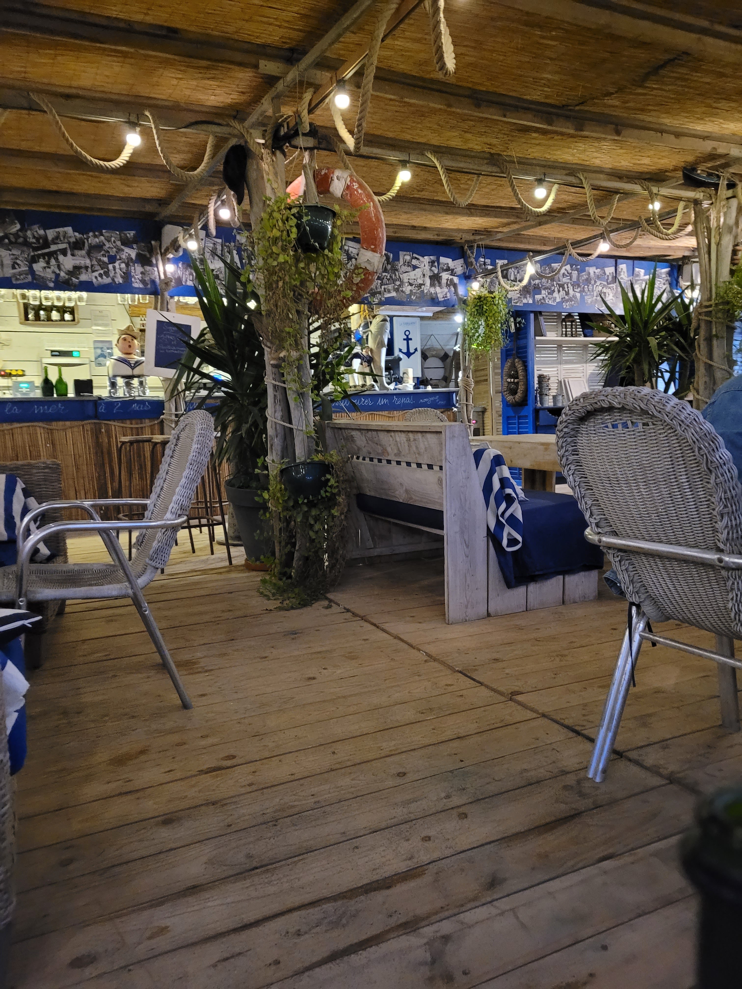 Le cadre est simple et très sympa. Deco plage les pieds dans le sable la cuisine est très bonne grande surprise et les desserts le sont aussi. Une carte assez simple avec des tapas a partager, entrées plats et desserts. Petit point négatif les prix sont quand même assez élevés sur certains plats voir dessert comme un tiramisu a 10€ ou les coktails. Nous ne regrettons pas d'y être passé