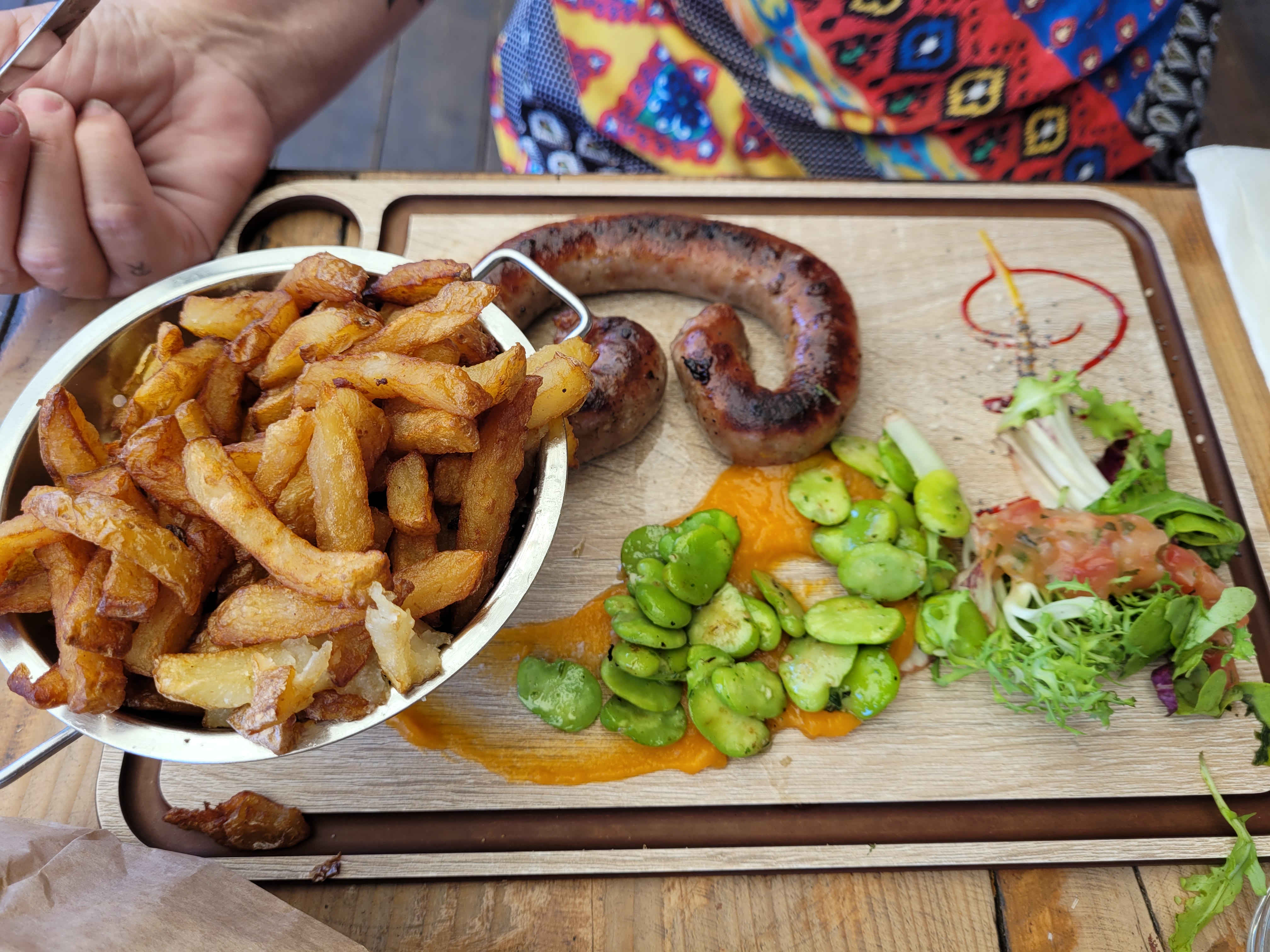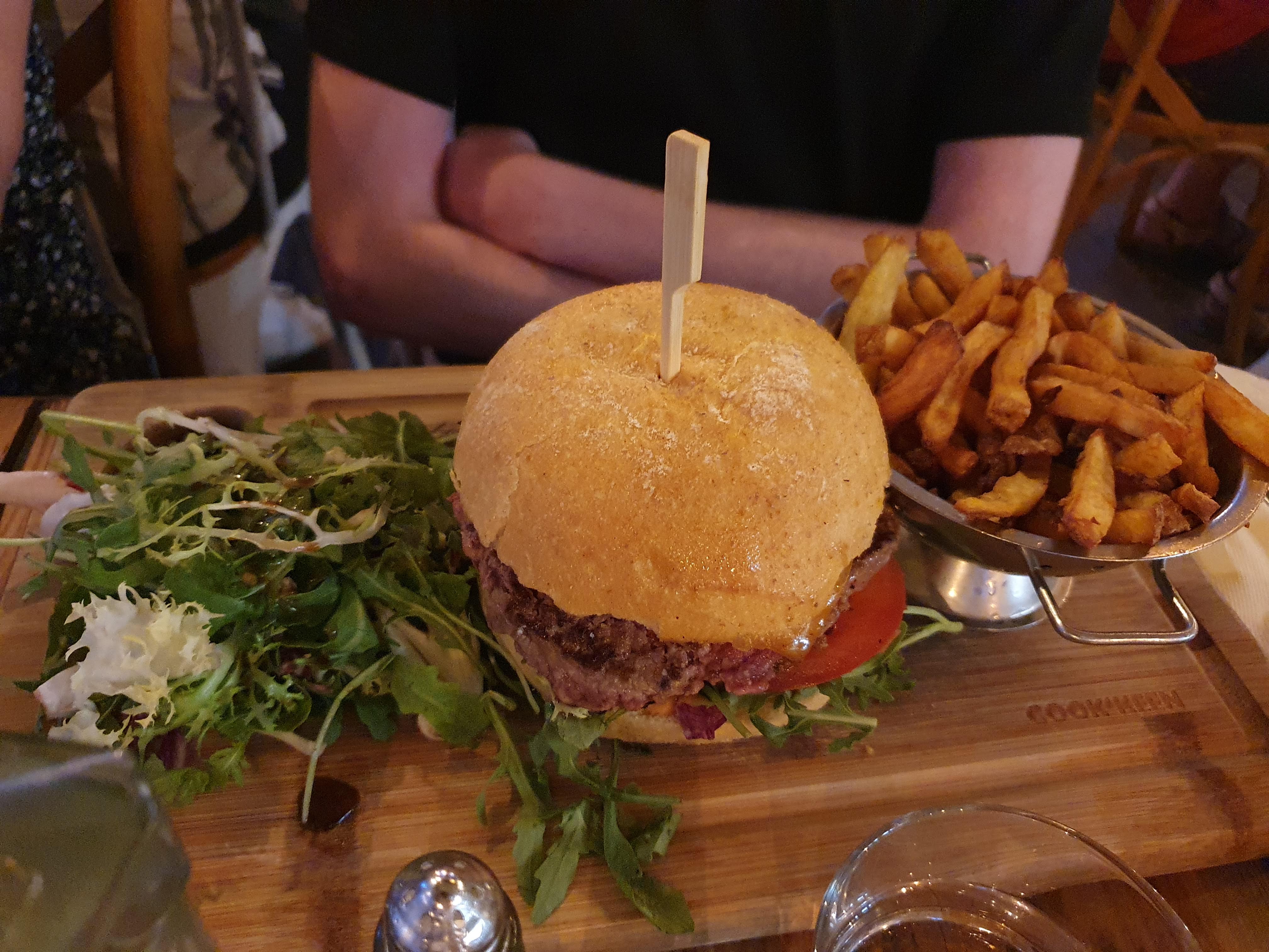 Nous étions sur la terrasse extérieure en plein soir de pluie donc il faisait super froid! Malgré le chaleureux accueil des serveurs la nourriture ne m’a pas satisfaite du tout. J’ai pris un classic burger steak saignant. Je me suis retrouvé avec un steak cuit sur un côté et bleu de l’autre pas assaisonné. Le pain du burger était très dur et le cheddar était orange fluo pas fondu sans aucun goût. La portion de frites n’est pas conséquente du tout pour le prix payé. J’ai du prendre des frites en plus pour 4€. La portion elle même est arrivé dans une petite coupole. Minime pour ce prix là.