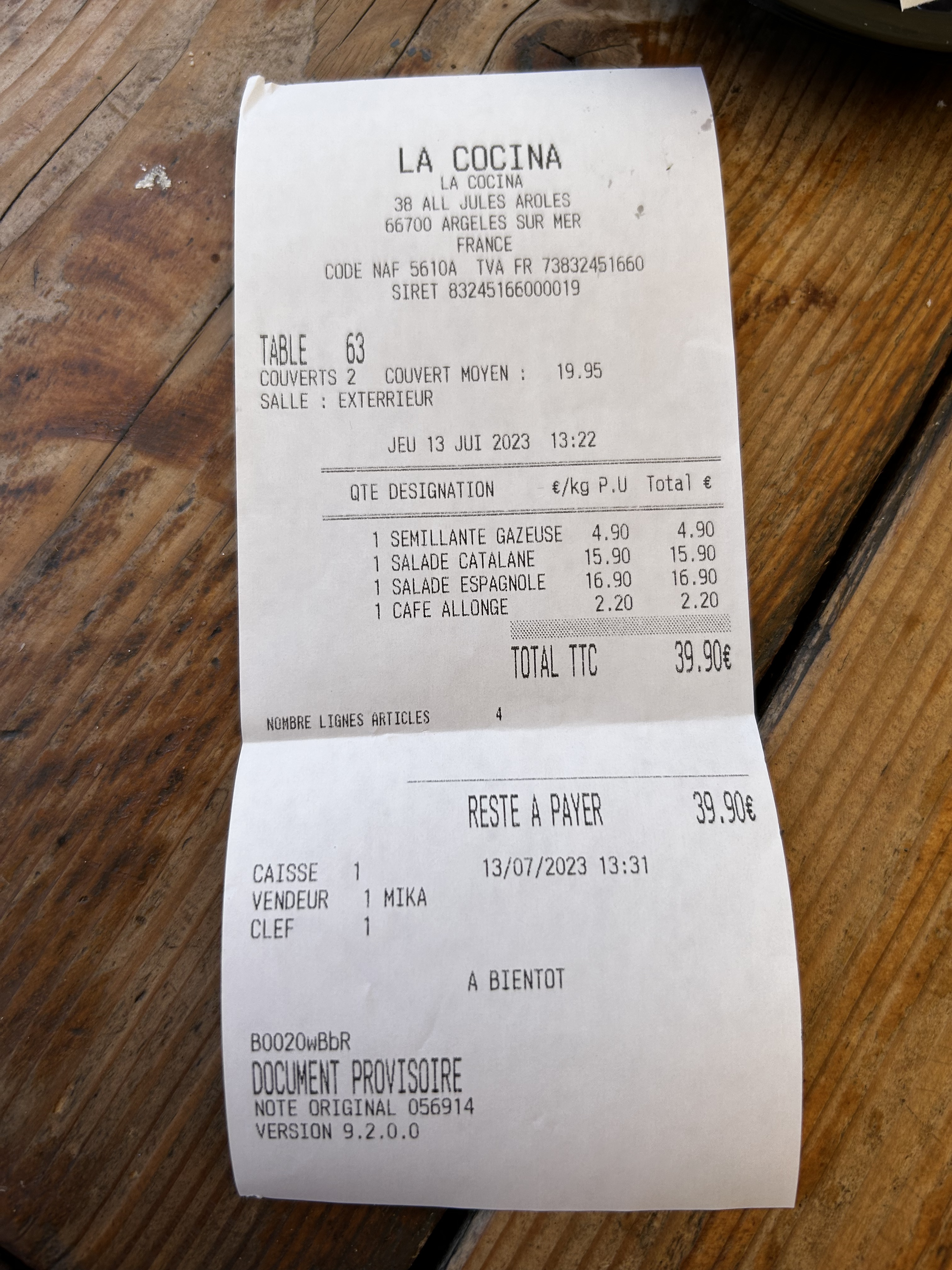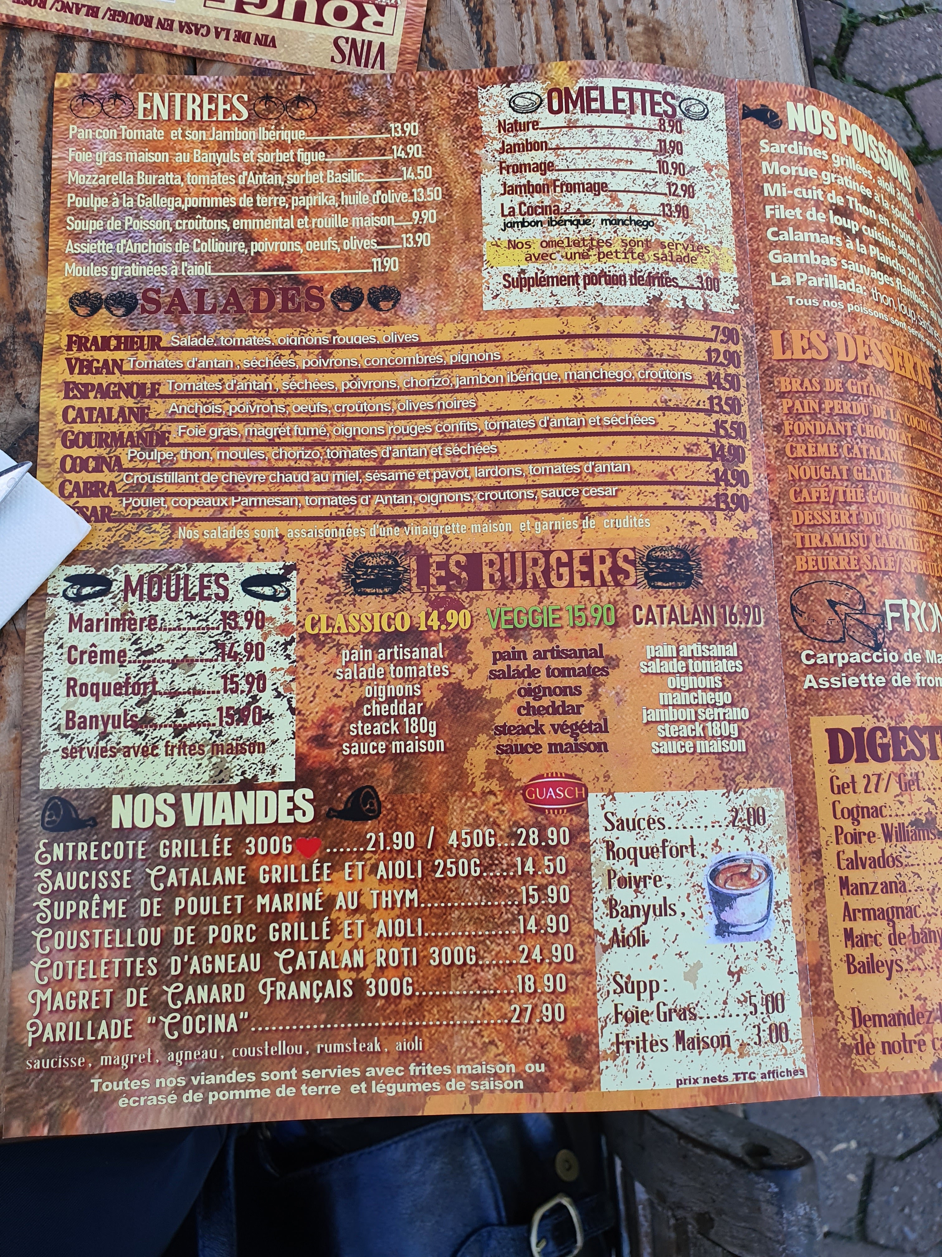 Arrivez vers 22h30 sur Argeles, on a pu manger rapidement et surtout c'etait très bon ! Vous pourrez voir sur mes photos, ni gras , ni trop salé avec des produits Frais et de saison ! Merci à l'équipe de la cocina !