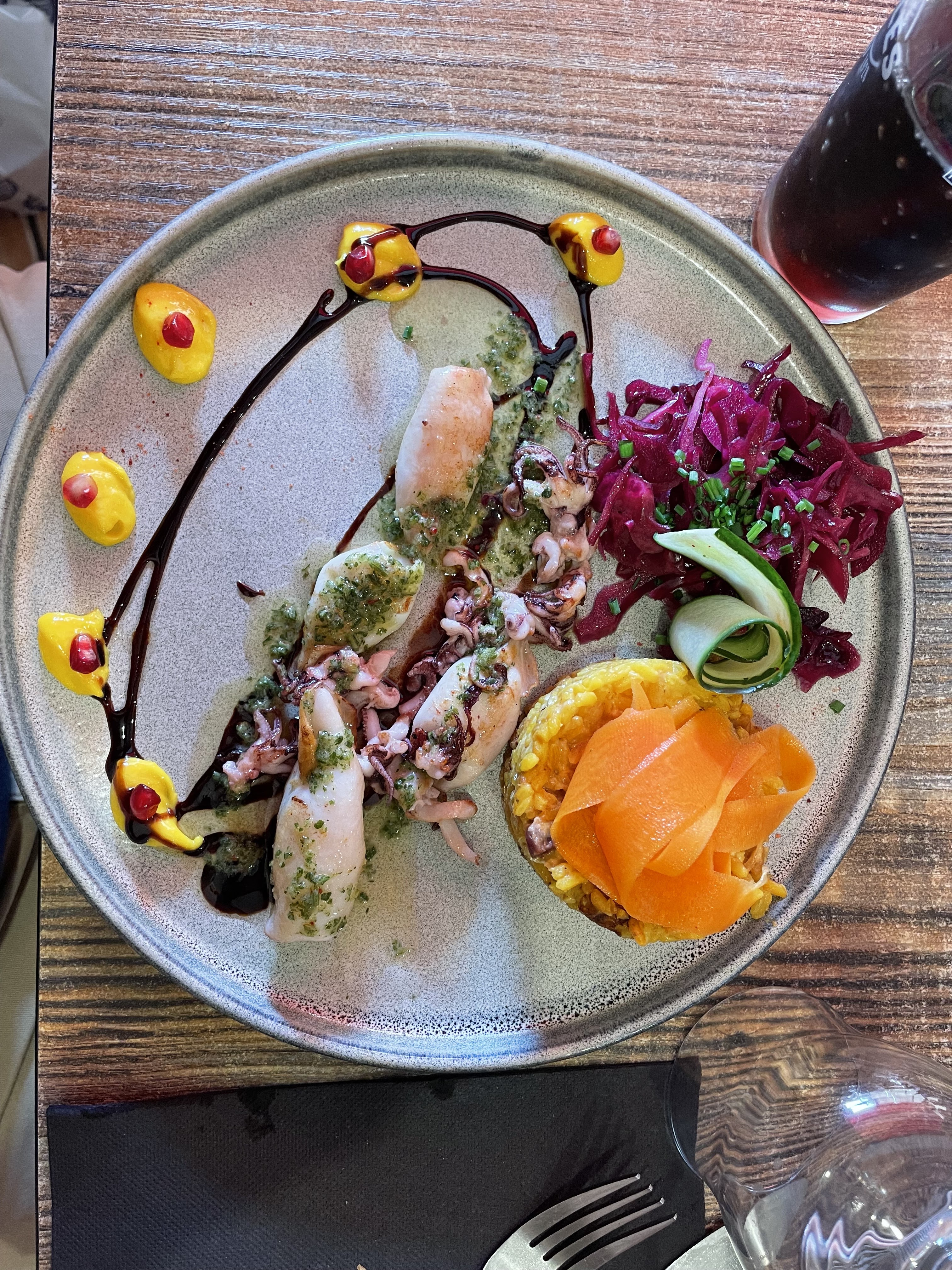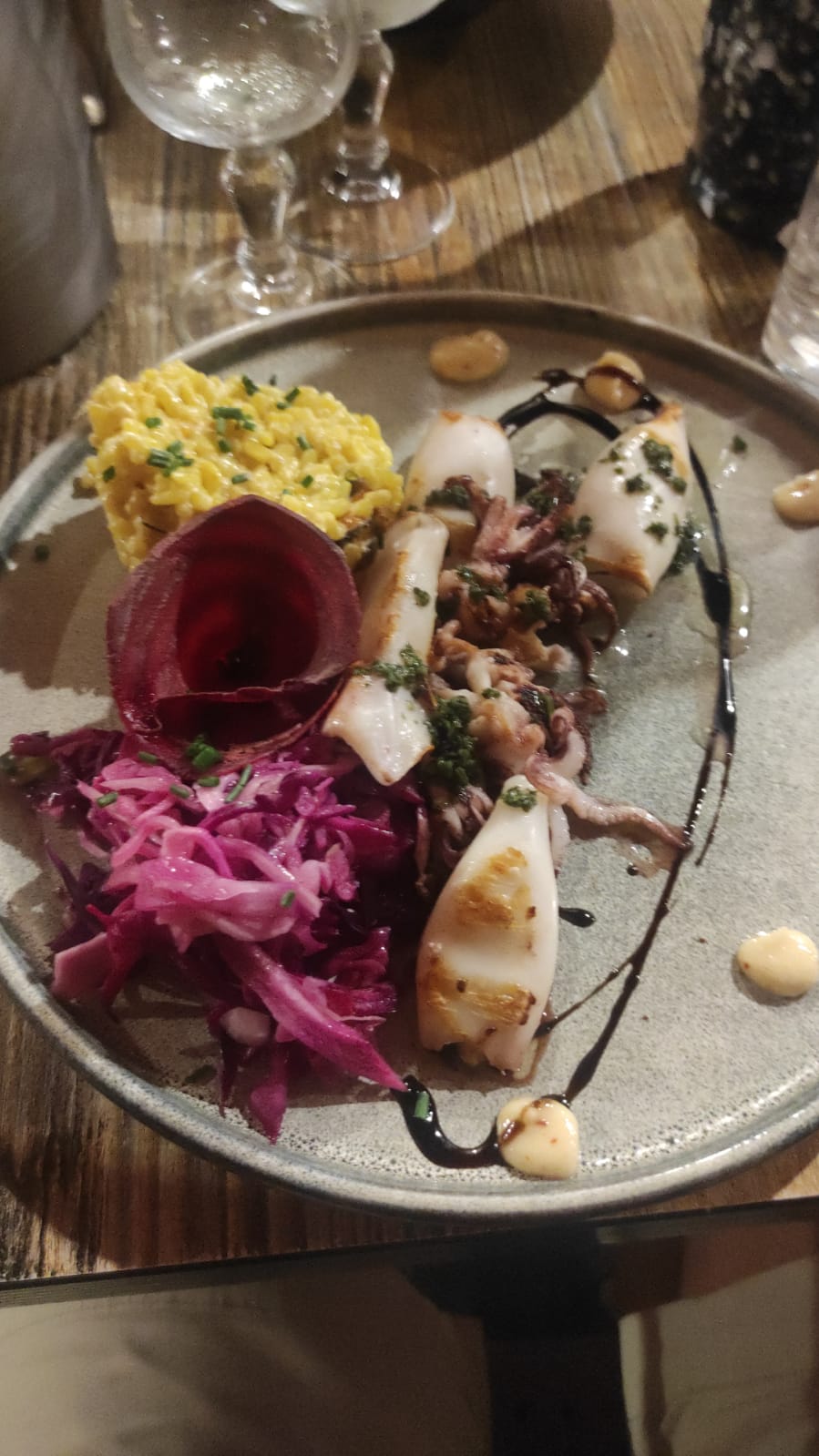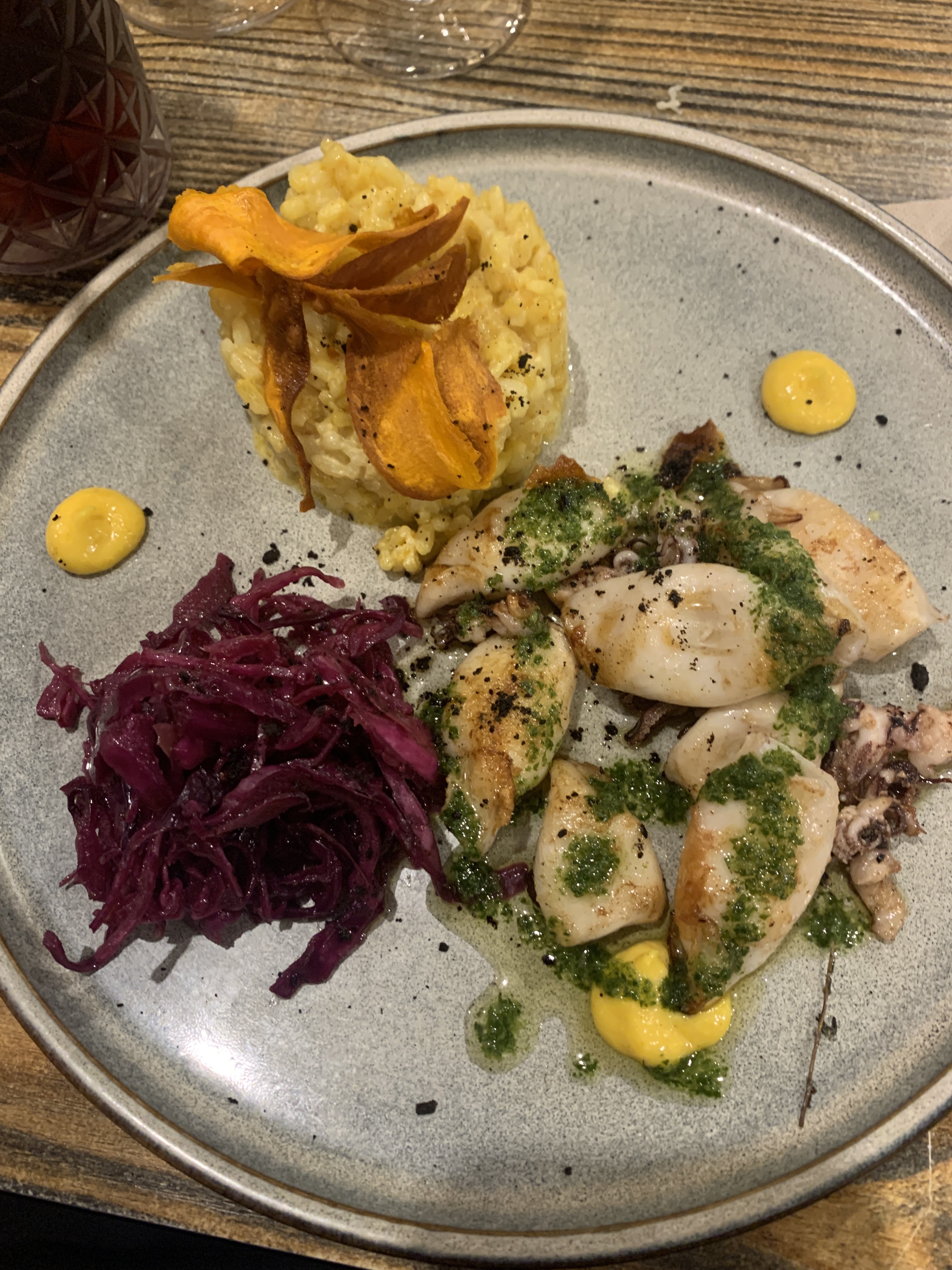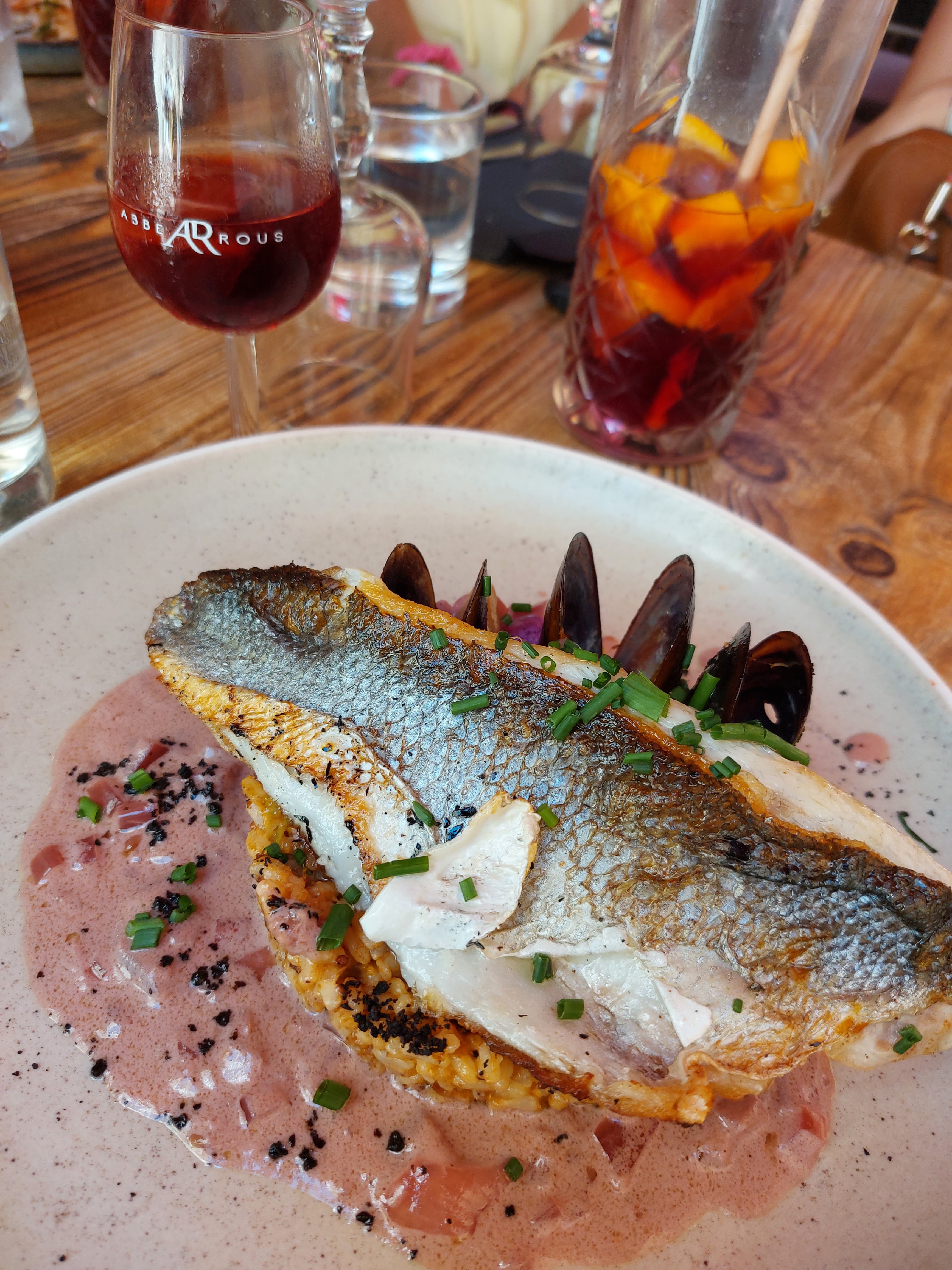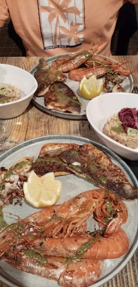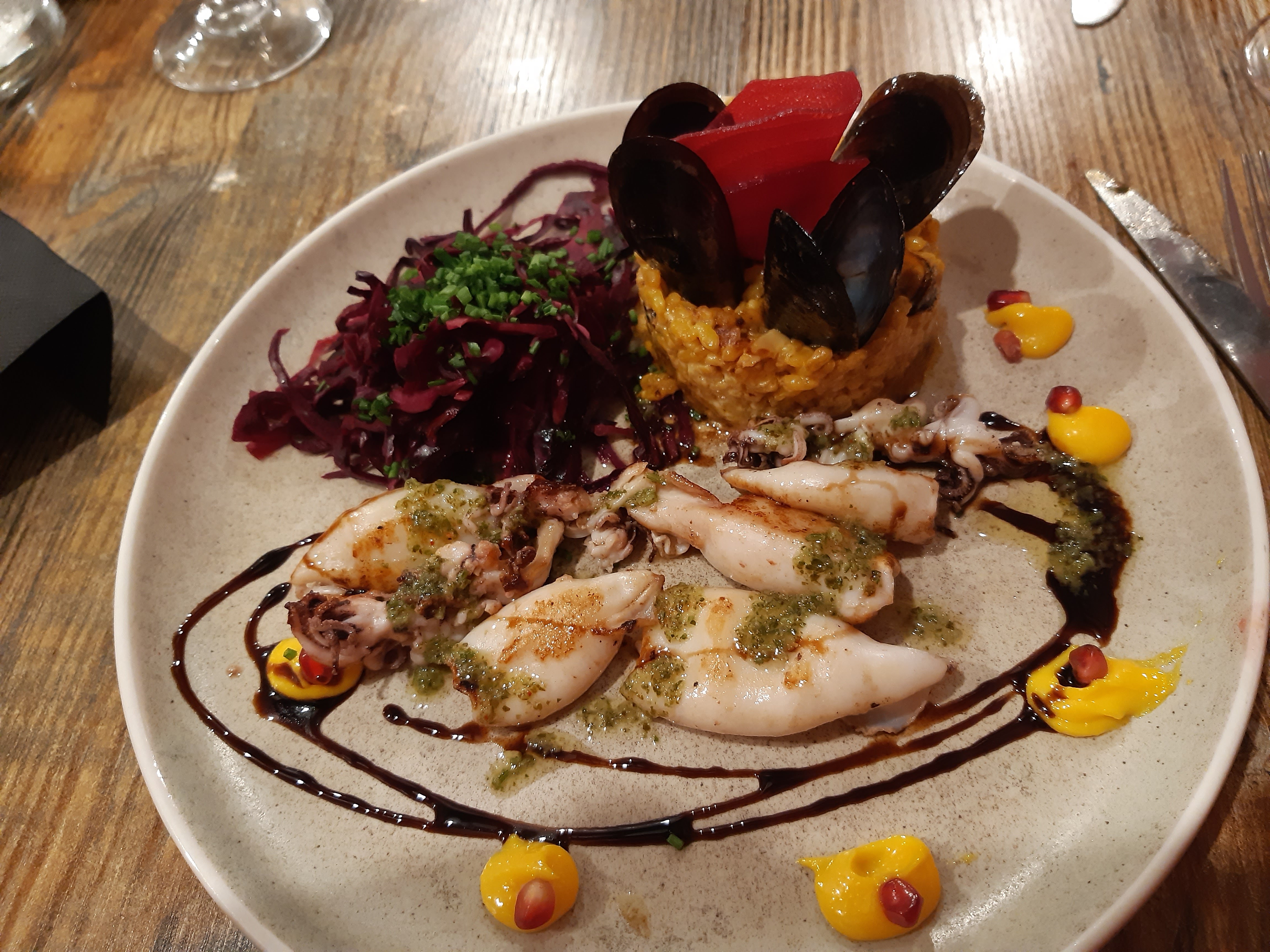 Nous n'avons mangé que le plat principal, mais quel régal ! Gambas et calamars grillés avec risotto aux moules. Un délice et le prix n'est vraiment pas excessif. Nous le conseillons vivement !