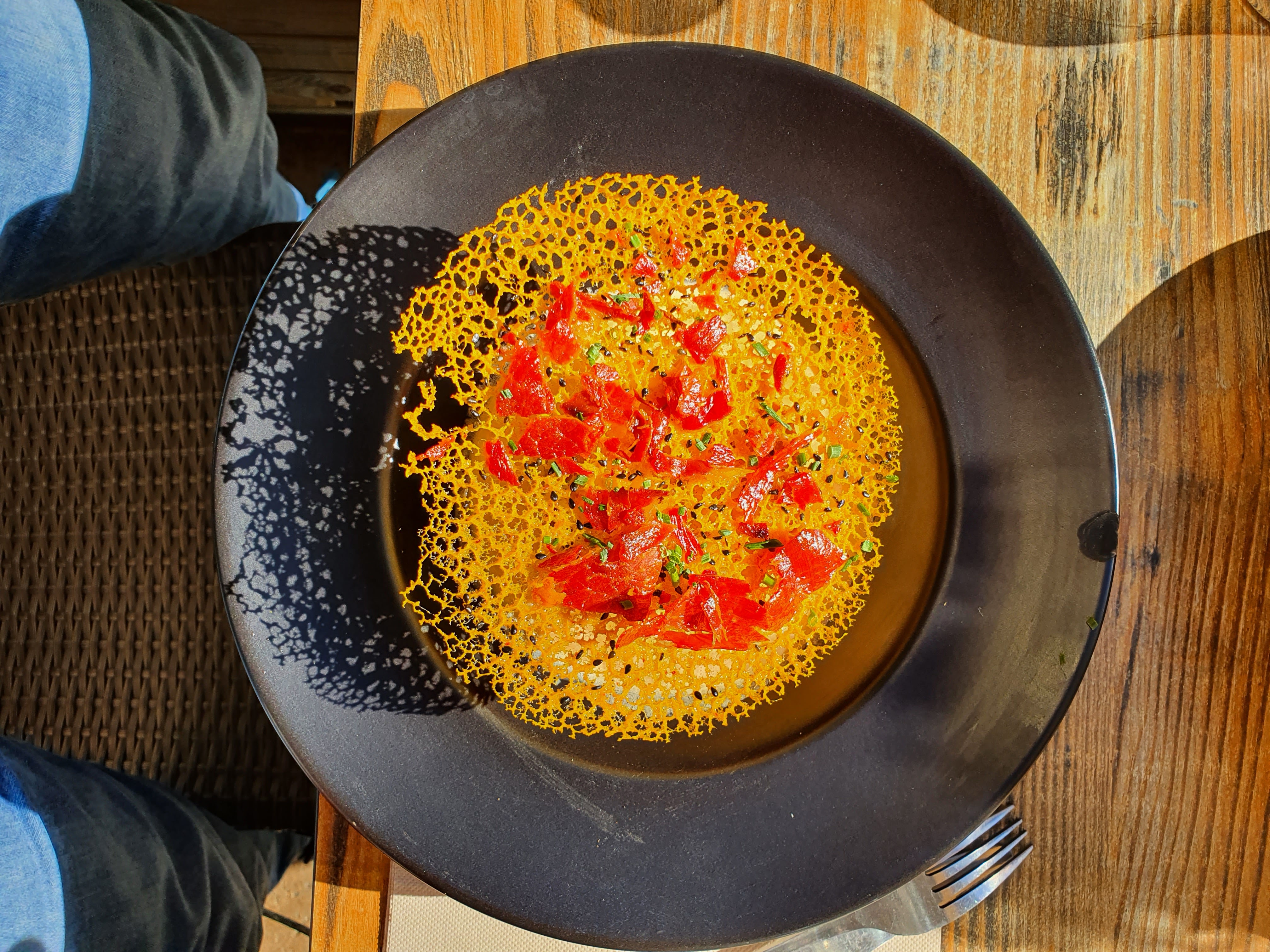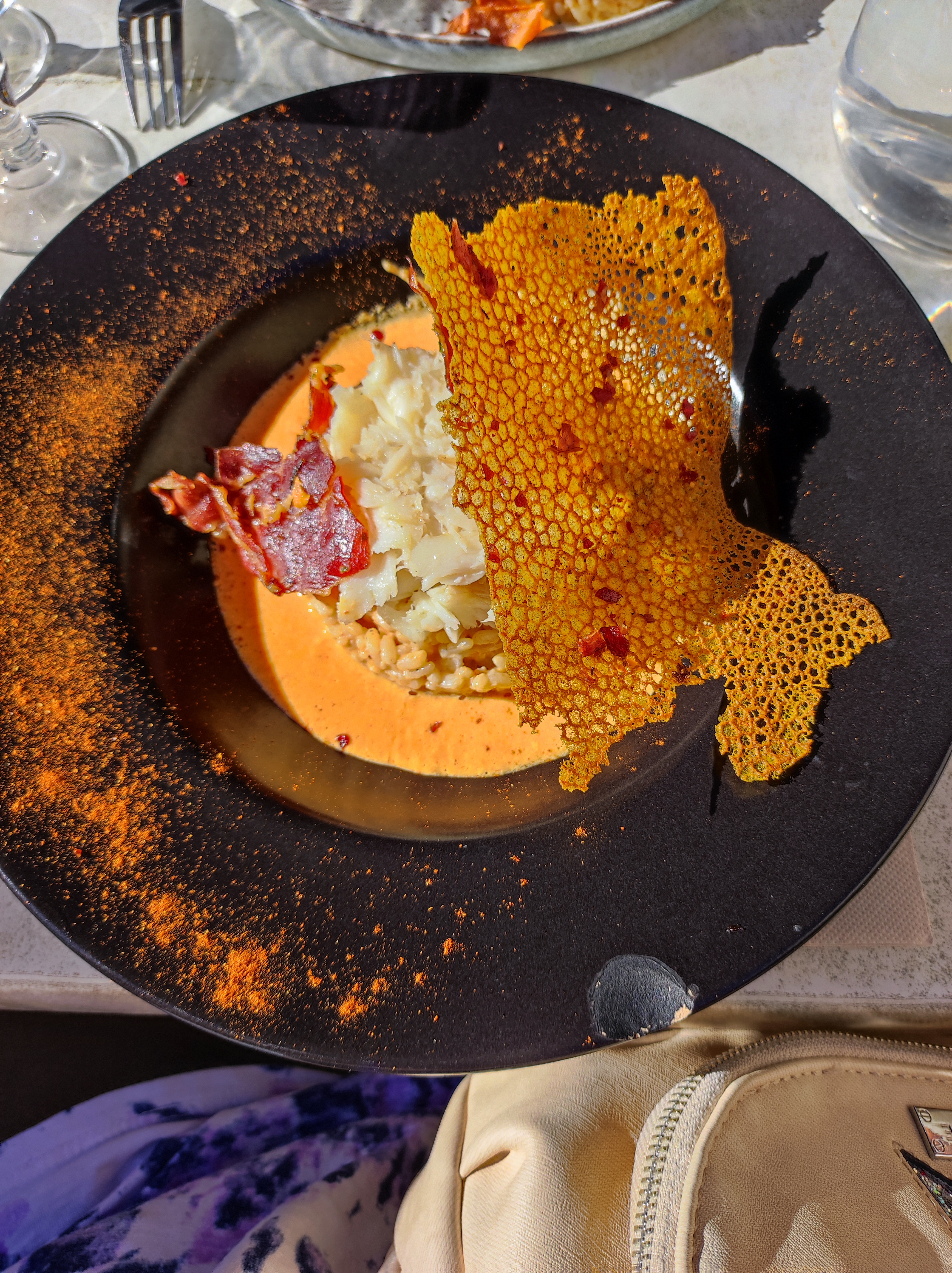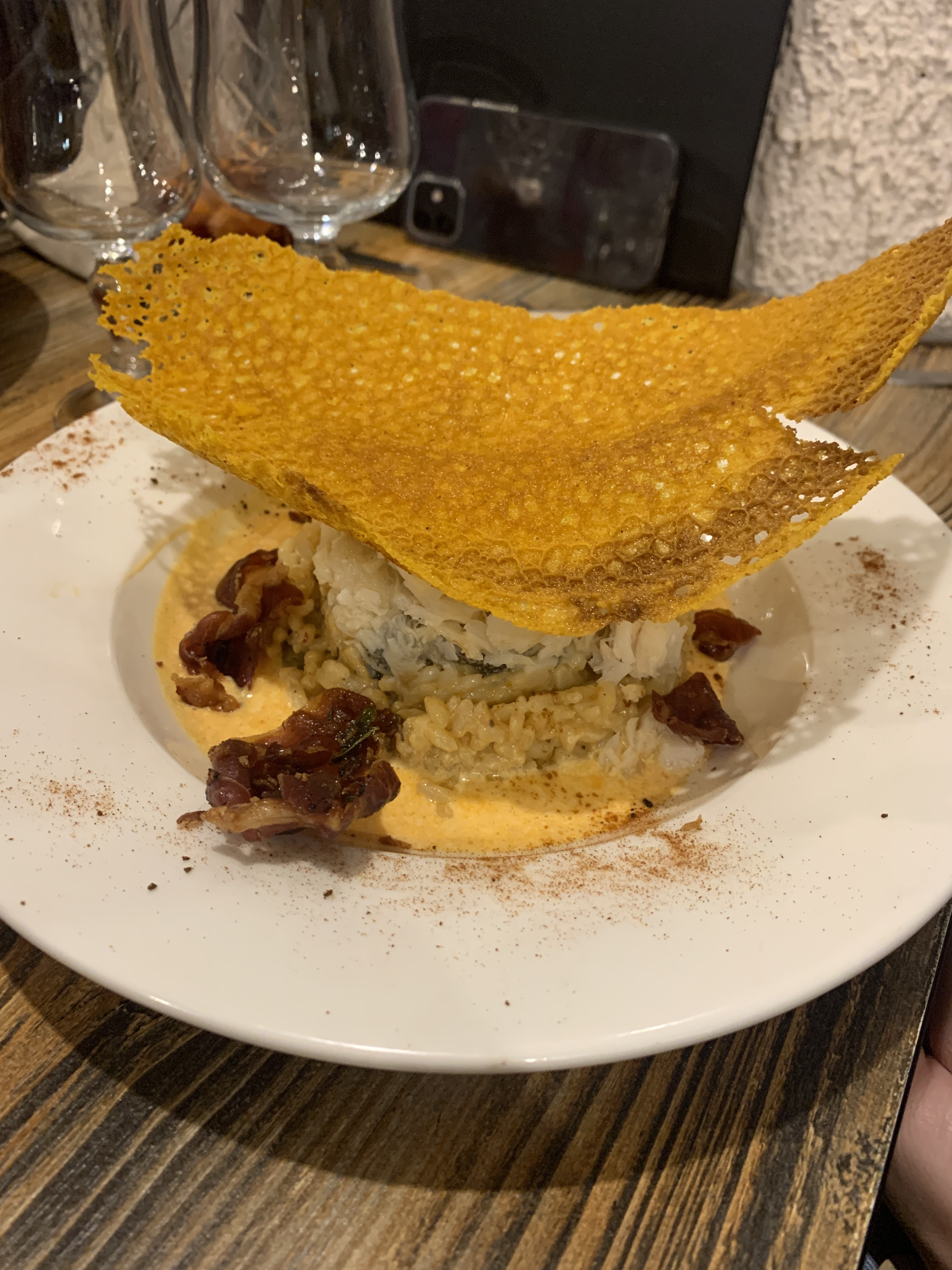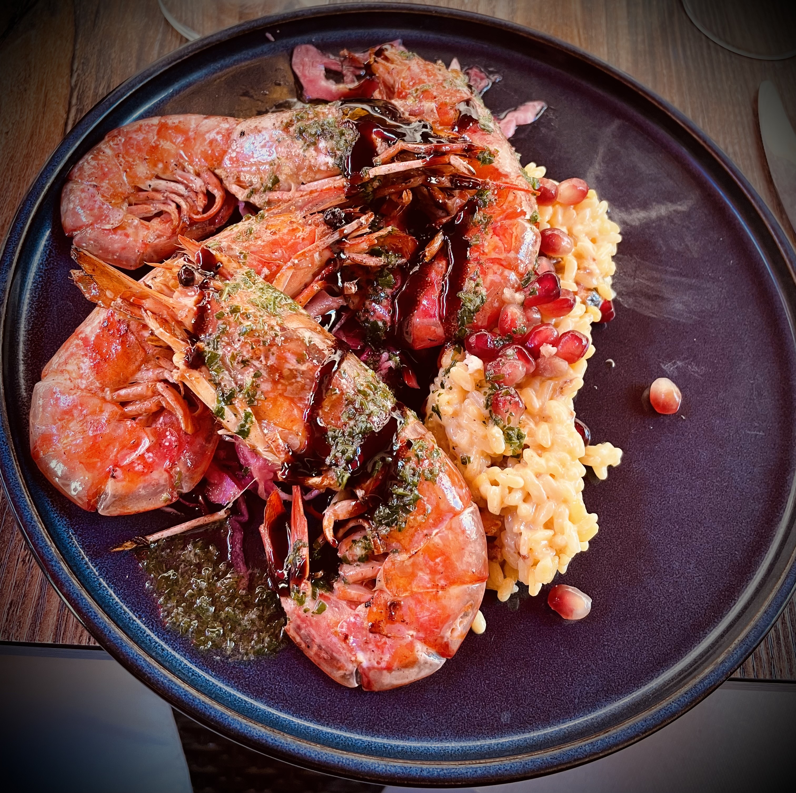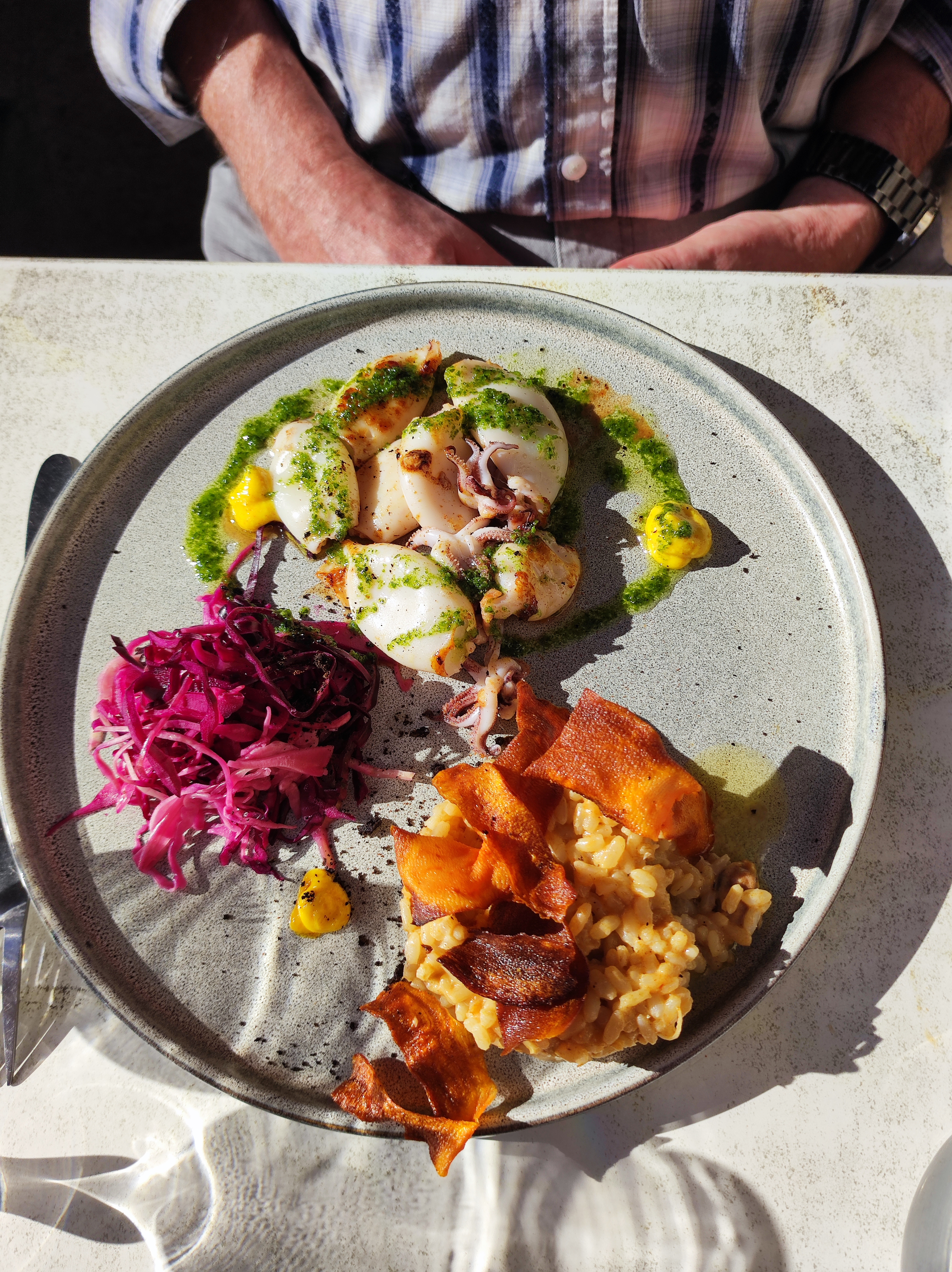 Nous n'avons mangé que le plat principal, mais quel régal ! Gambas et calamars grillés avec risotto aux moules. Un délice et le prix n'est vraiment pas excessif. Nous le conseillons vivement !