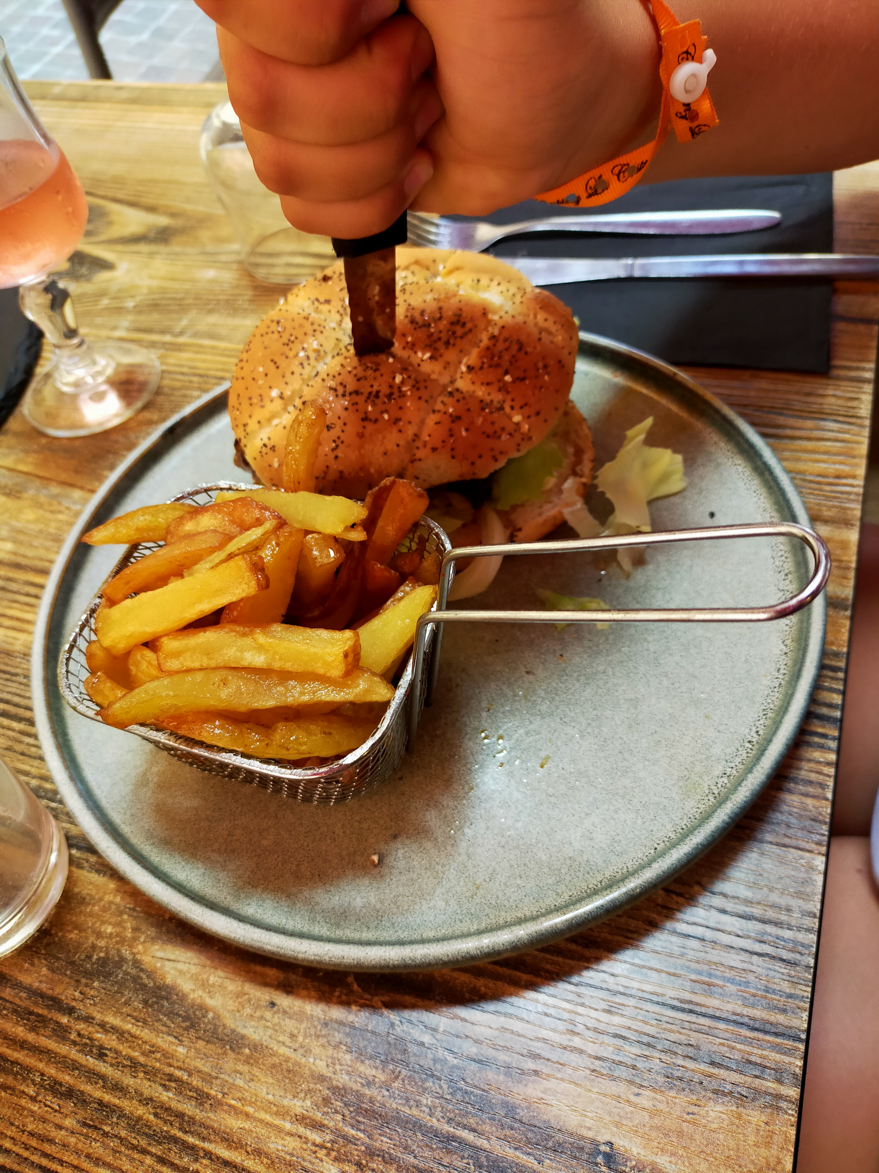 +: serveur dynamique, agréable et de bons conseils, choix (burger +++ mais cuisson pas respectée), prix des menus très attractifs, cadre (petites ruelles et musicien de rue). -: attente entre l'entrée et le plat, cuisson des calamars mal maîtrisée (trop cuits), changement de propriétaire donc la carte restaurant APETIZ n'est plus acceptée (alors que sur le site l'inverse est indiqué).
