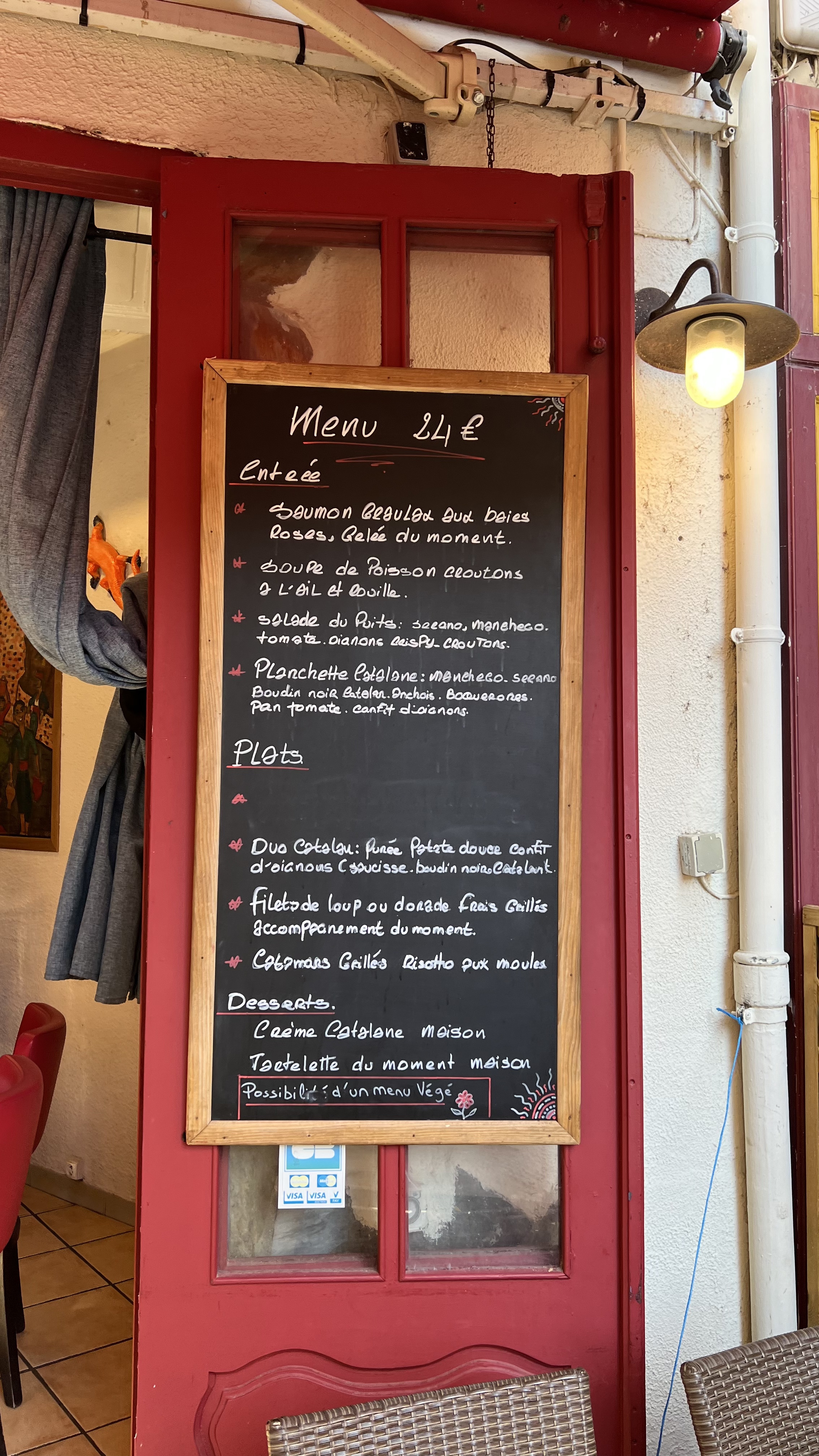 Merci à l’équipe en salle, nous avons pris un menu 3 services à 24€ et sommes absolument satisfaits, effort de présentation dans l’assiette, produits de qualités, le tout servi par une jolie équipe de jeunes ! Rapport qualité prix très appréciable pour Collioure !