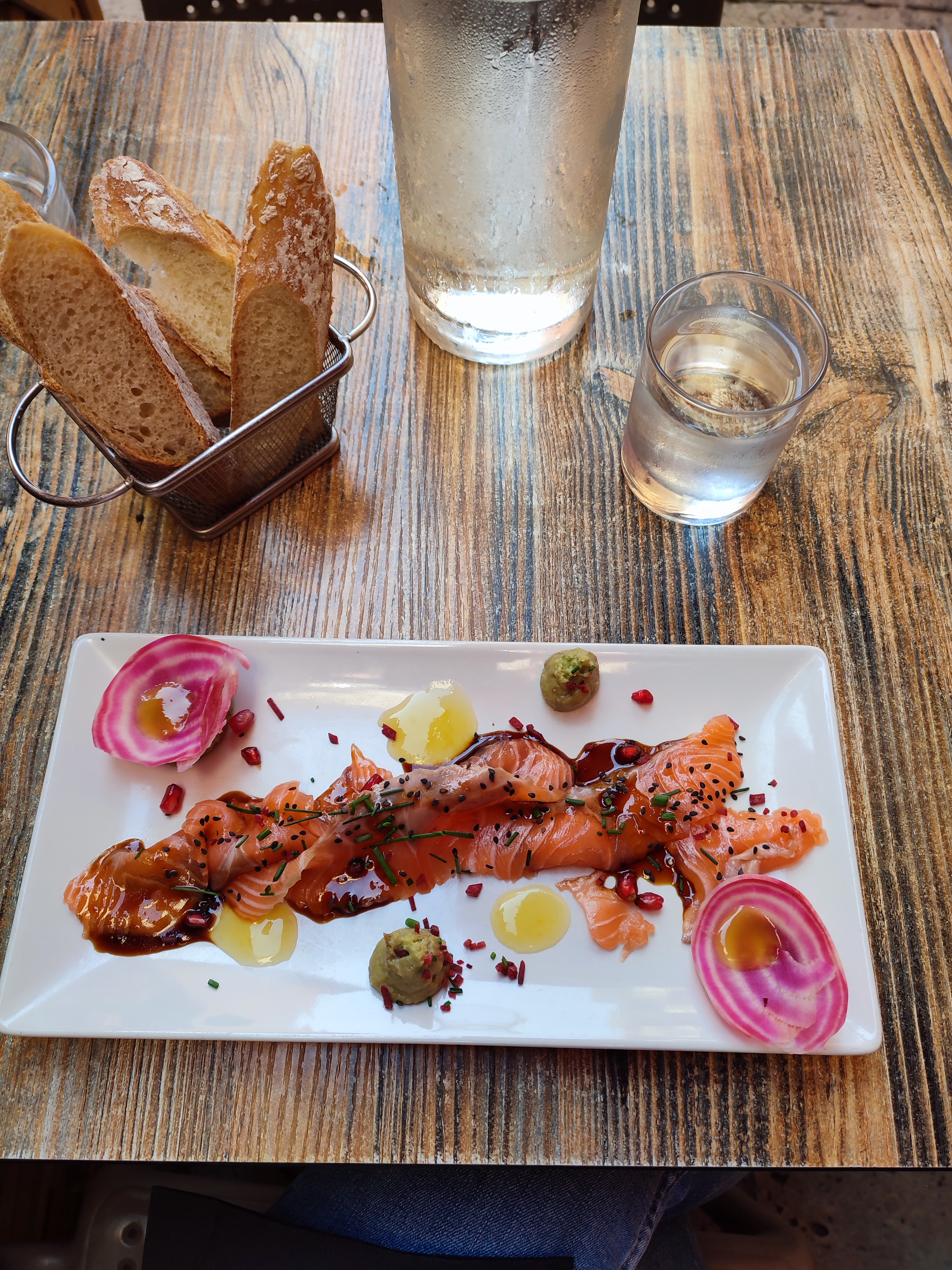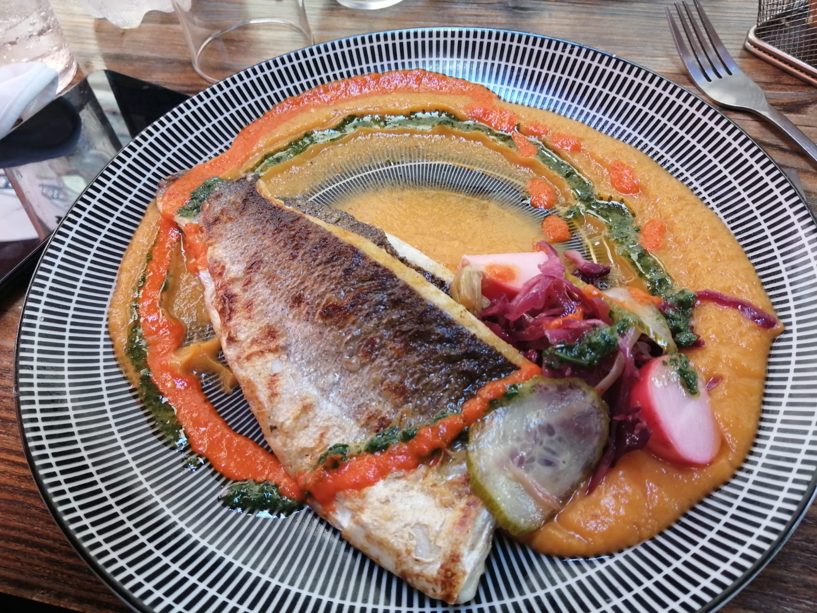 Commandé de la dorade accompagné de houmous, en plat simple. J'ai trouvé ça cher pour la petite quantité dans l'assiette. Du monde en terrasse et en salle avec 2 seuls serveurs, dont un débutant. Chapeau à lui car l'apprentissage du métier ne s'est pas déroulé dans les meilleures conditions ! Rien que pour lui je mets 2 étoiles car ça n'en valait pas plus.