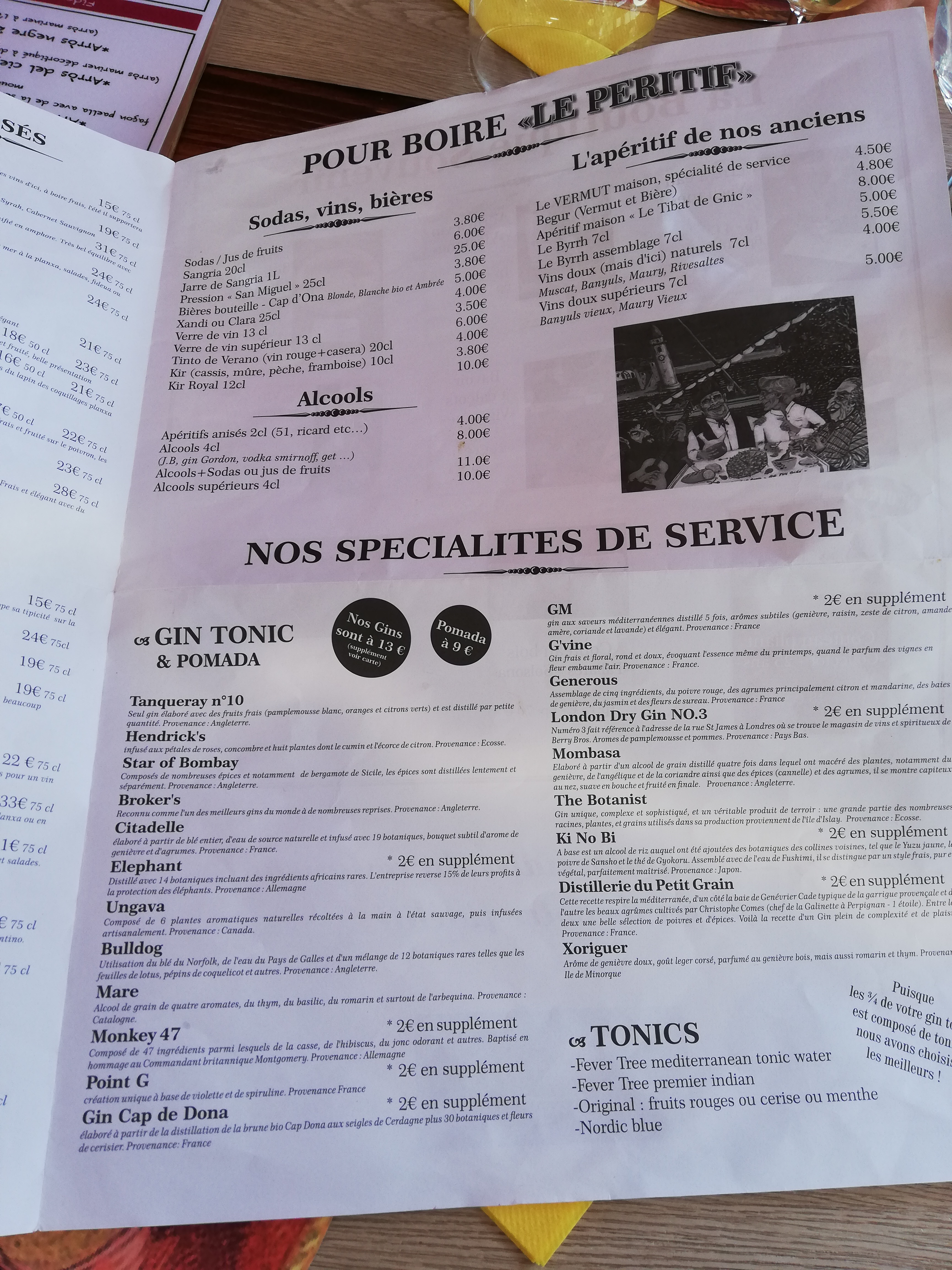 Excellent ! Restaurant typiquement Catalan ! Super déco , super choix de carte , très bonne acceuil , petit vermouth du patron un délice ! Au top ! Attention à l'escargolade ce sont des escargot très salée et très baveux on aime ou on déteste mais réfléchie bien !