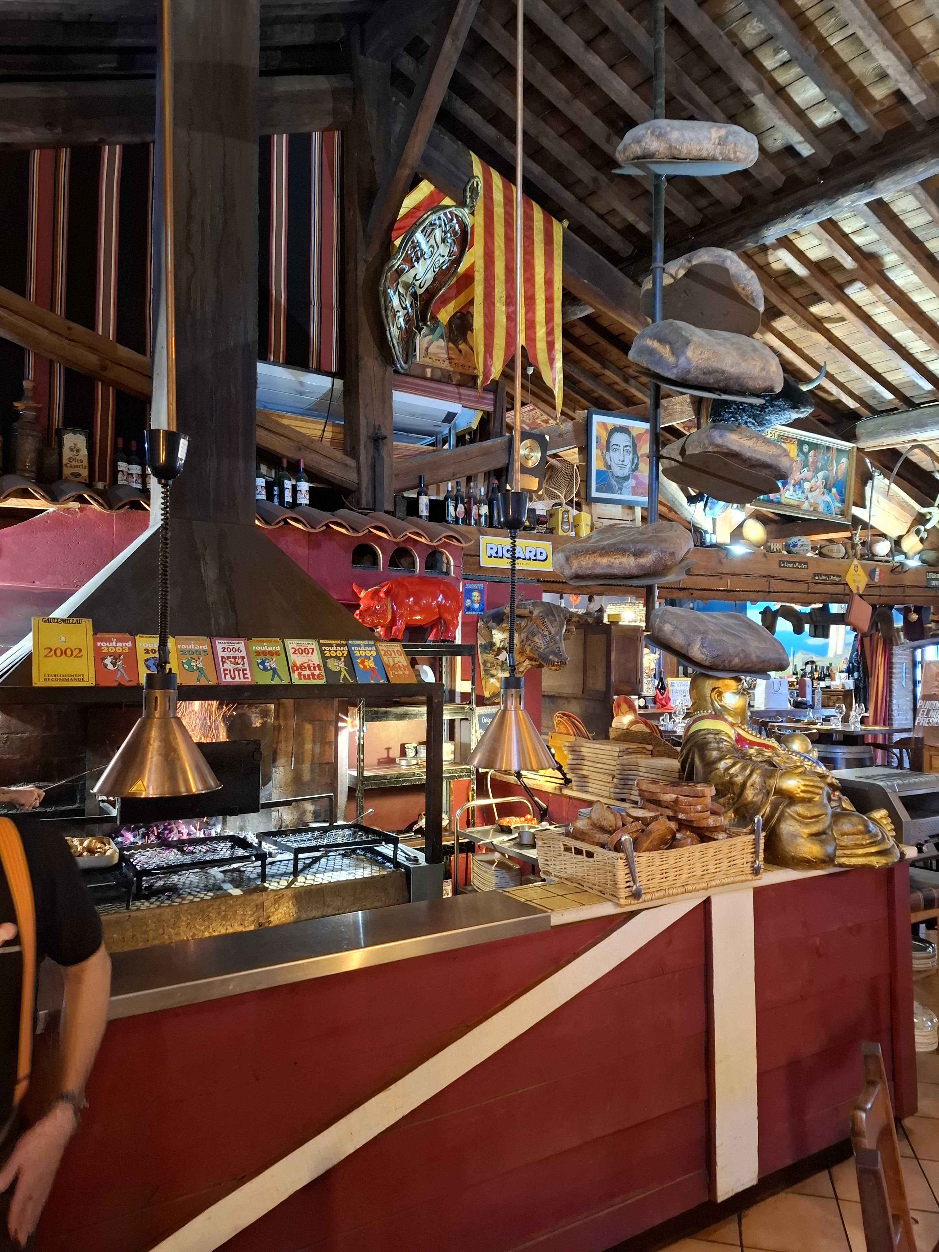 Lieu incontournable typique catalan. Avec une deco qui sort de l'ordinaire s'inspirant de la culture et des traditions de la catalogue (Salvador Dali, le petit train jaune, les dragons catalans...). Des plats excellents servi avec sourire, gentillesse et avec rapidité (moules à l'aïoli succulentes, magret cuit comme demandé et une morue à la catalane goûteuse)accompagné d'une large tranche de pain grillée avec son ail à frotter et sa tomate à écraser selon l'humeur de chacun. Un barbecue immense au milieu de la salle qui donnerai envie à tout amateurs de cuisine à la braise !!! Et les desserts...Une crème catalane et un bras de venus juste succulents !!!
